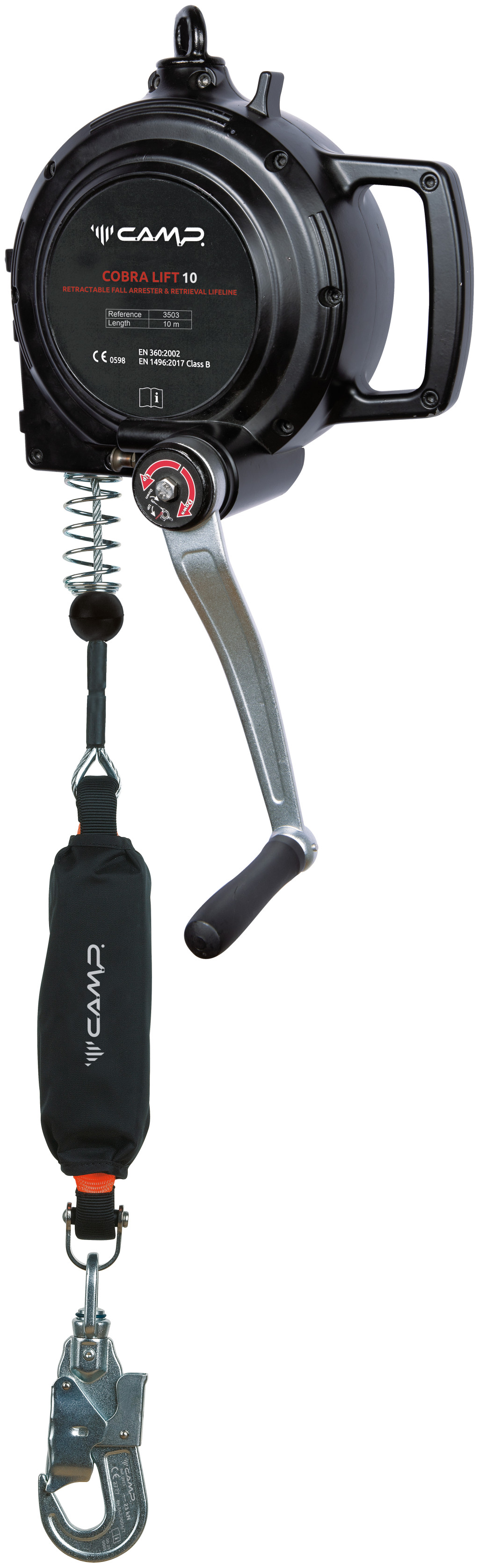 10 m hosszúságú, önbehúzó zuhanásgátló, fogantyús visszahúzó mechanizmussal.