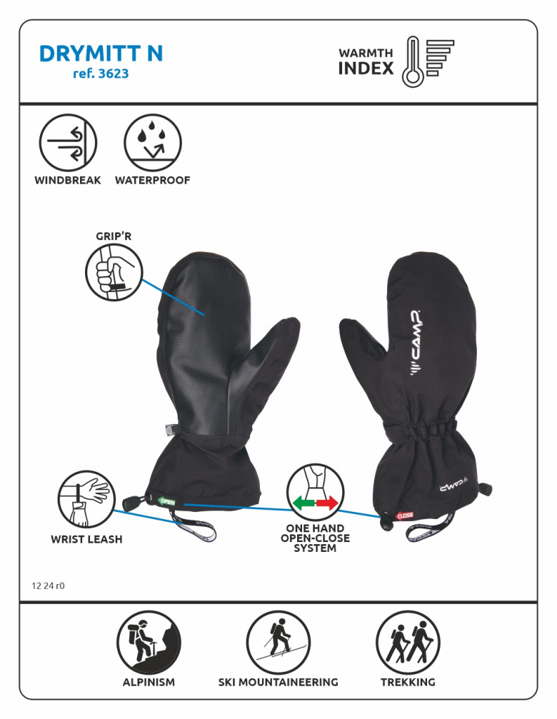 A kompakt, időjárásálló kesztyűk úgy lettek kialakítva, hogy kesztyű felett lehessen viselni őket. A vízálló anyagok és a ragasztott varrások kizárják a szelet és a nedvességet. A könnyebb csomagolhatóság érdekében egymásra rakható anyagokkal is ellátták.