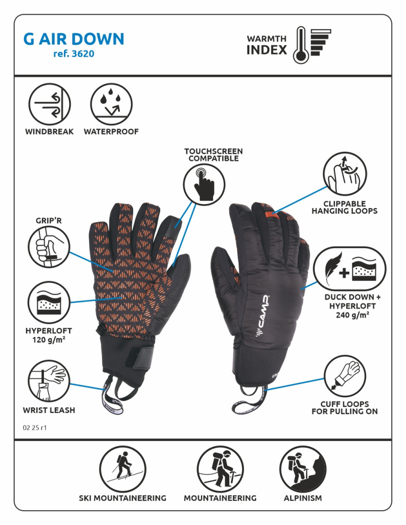 A G Air Down maximális hőszigetelést és kiváló érzékenységet ötvöz a hegyek leghidegebb napjaira. A fő réteg dupla szigetelése Hyperloft 240 g/m2 belső réteget tartalmaz, amely közelebb van a kézhez, míg a külső réteg kacsapehelyből áll, amely extra loft hatást biztosít, és védi a kezeket a hidegtől. A   Round Finger” konstrukció precíz illeszkedést biztosít a jó érzékenység és tapadás érdekében. A tapadást tovább fokozzák a tenyér és az ujjak szilikon Grip'R betétjei. A vízálló és lélegző DRYZONE® membrán növeli a termék többcélú jellegét. A könnyű külső anyagok és a G Air kesztyűkre jellemző áramvonalas konstrukció különösen könnyen csomagolhatóvá teszi a G Air Down kesztyűt a magas szintű szigetelésnek köszönhetően.