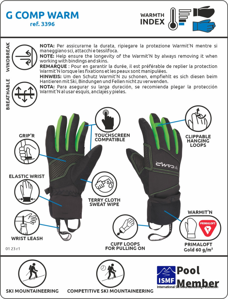 A G Comp Warm magas szintű védelmet nyújt a hideg ellen a speciális Warmit'N technológiának köszönhetően – egy könnyű, szigetelt kesztyű ripstop nejlon héjjal és PrimaLoft® Gold 60 g/m2 szigeteléssel, amely használaton kívül a csuklón lévő tokban tárolható, és kihúzható az ujjakra, amikor extra védelemre van szükségük (a tenyér szabadon marad a tapadás és a kézügyesség érdekében). A Warmit'N hozzáadása olyan sokoldalúságot biztosít, amelyet más kesztyűk egyszerűen nem tudnak elérni. Az alapkesztyűt úgy tervezték, hogy megfelelő szintű védelmet nyújtson túlmelegedés nélkül aerob használat közben. A tenyérrészen található szilikon Grip'R betétek segítik a fogást, a kézügyességet és a finommotoros kontrollt, a tenyérrész pedig megerősített a botokkal való fokozott szilárdság és tartósság érdekében.   MEGJEGYZÉS:  A Warmit'N hosszú élettartamának biztosításához mindig vegye le, amikor kötéssel és skinnel dolgozik.