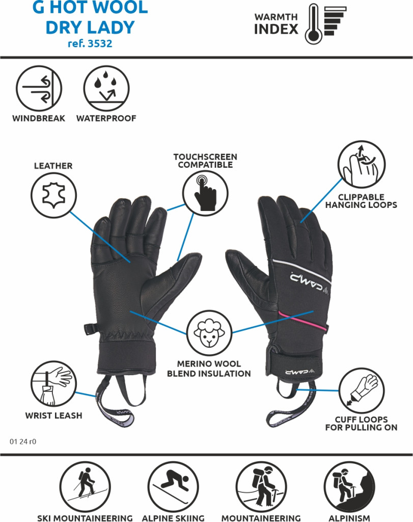 A G Hot Wool Dry Lady egy egyedülálló all mountain kesztyű, amelyet természetes anyagok használata jellemez, amelyek magas szintű teljesítményt és természetesen meleg, száraz hőmérséklet-szabályozást biztosítanak 60% merinógyapjúval kevert szigeteléssel. A tenyér és a kopáspontok megerősítése prémium minőségű kecskebőrből készült a kézügyesség, a tapadás és a tartósság megfelelő kombinációja érdekében. A vízálló és lélegző DRYZONE® membrán növeli a termék sokoldalúságát. Az ujjak „Dart Finger” konstrukciót használnak, amely kiküszöböli az ujjak négyszögletes varrásának oldalsó öltéseit a kiváló kényelem és a pontos fogás érdekében.