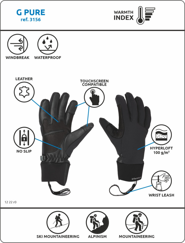 A G Pure konstrukcióját úgy tervezték, hogy egy testhezálló kesztyűt alkossanak, amely ideális hegyi technikai tevékenységekhez. A hátrész varrásmentes, a csuklórész pedig rugalmas az egész napos kényelem érdekében. A hideg és az időjárás viszontagságai elleni védelmet a fő testrészen található Hyperloft 100 g/m2 szigetelés és a DRYZONE® vízálló/lélegző membrán garantálja. A kopási pontokon kecskebőr megerősítésekkel ellátott báránybőr tenyér jó tapadást és kiváló tartósságot biztosít.