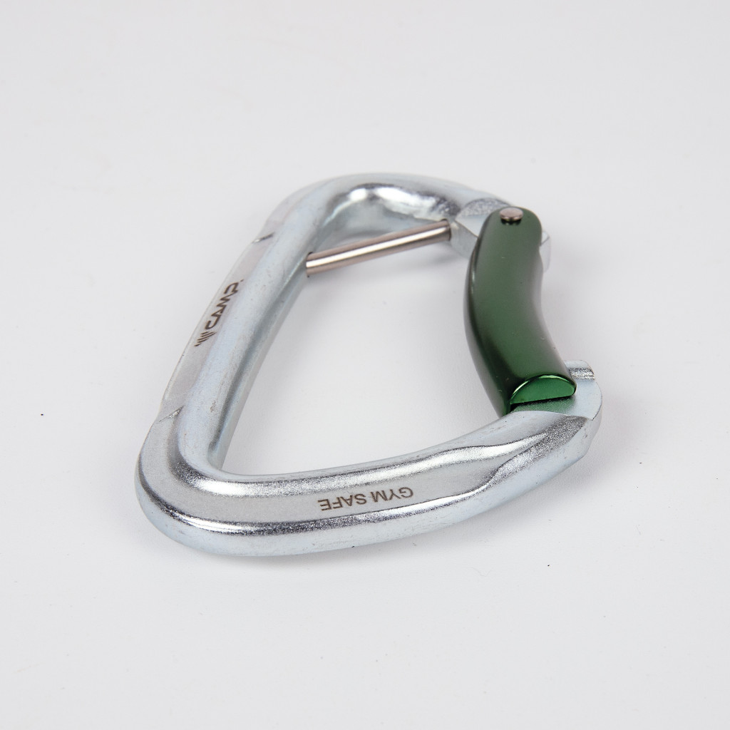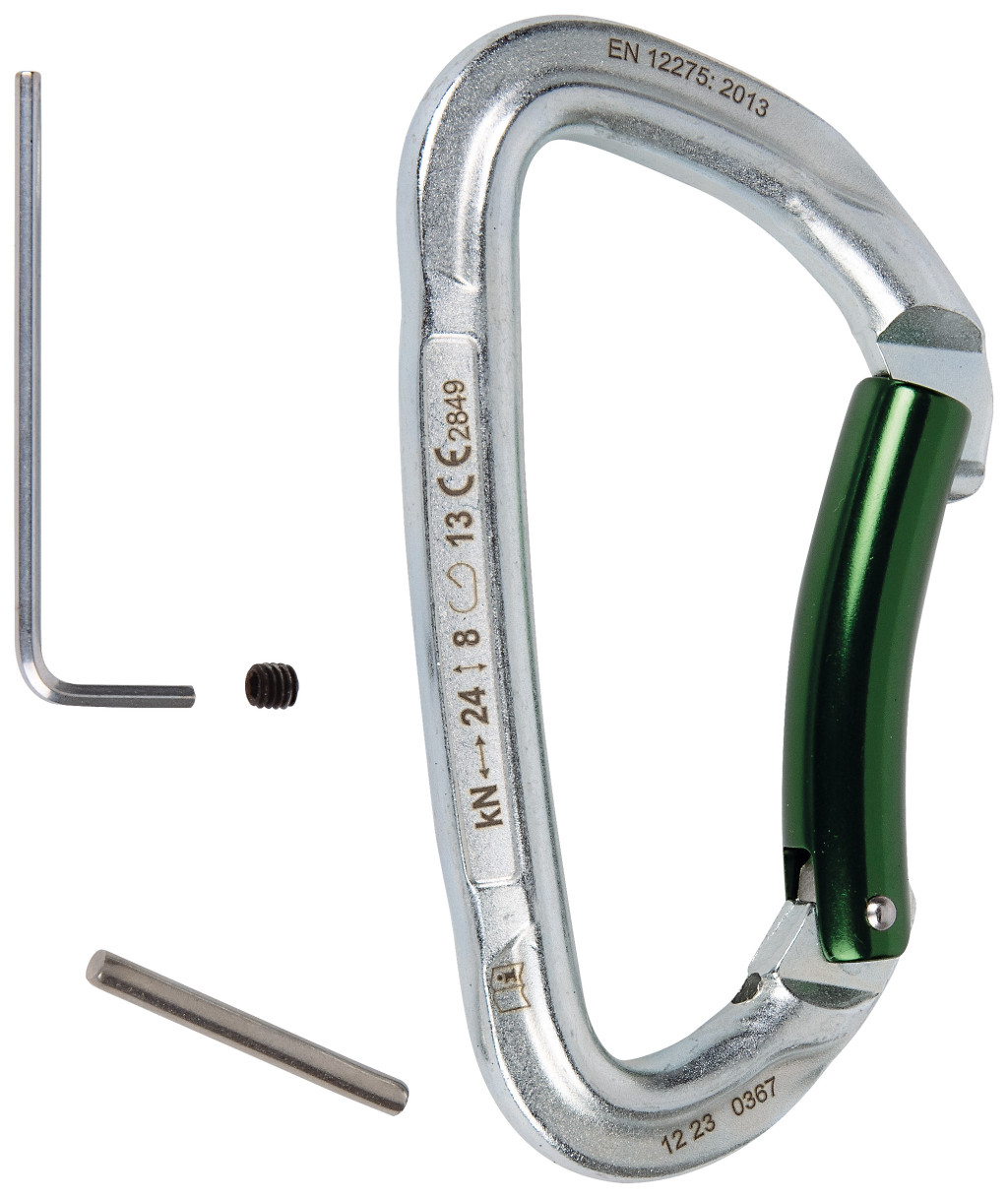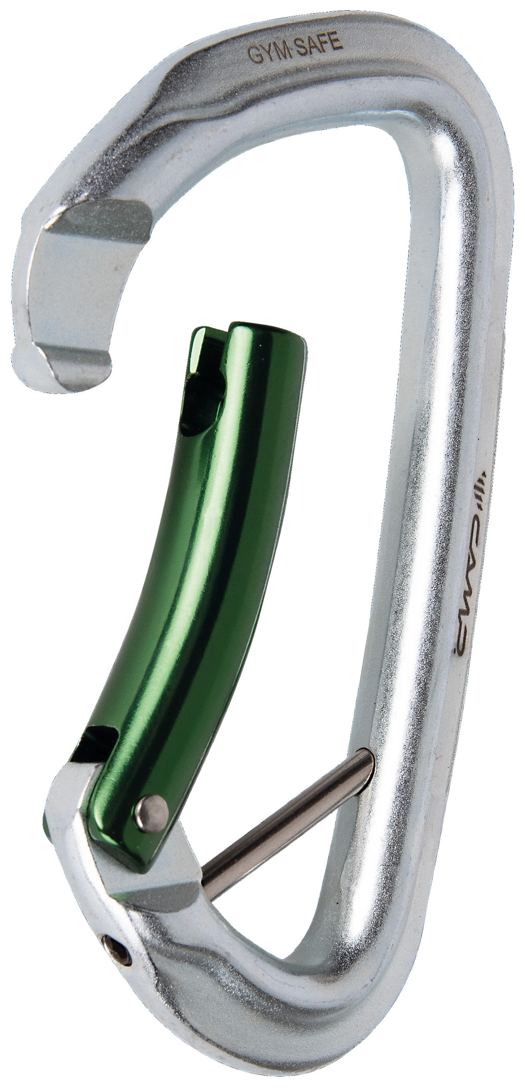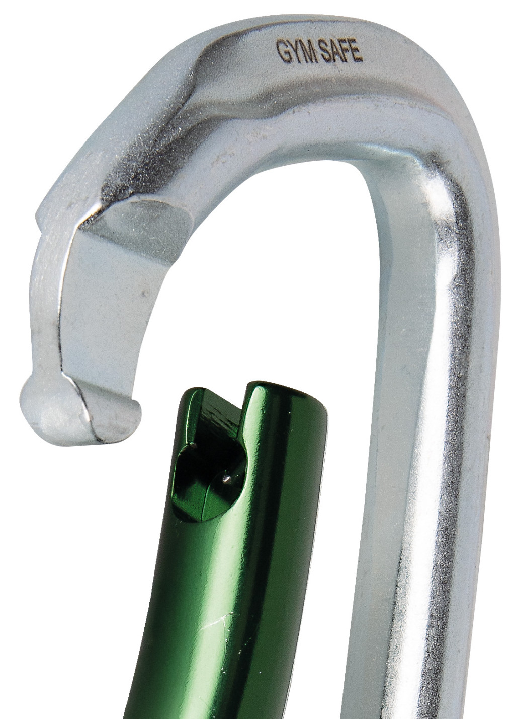 Acéltestű karabiner, amelyet kifejezetten edzőtermekben és kültéri, nagy forgalmú útvonalakon és horgonypontokon való használatra terveztek. Az alumíniumötvözetből készült hajlított kapu sima működése és széles nyitása a kulcsos zárral együtt megkönnyíti a rögzítést és a tisztítást. Egy speciális, csavarral rögzített rögzítőcsap rögzíti a karabinert a behúzófülekhez, hogy biztosítsa a megfelelő tájolást és megakadályozza a lopást (imbuszkulcs mellékelve).
