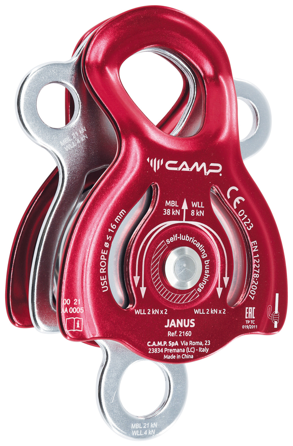 Nagy szilárdságú, multifunkcionális dupla csiga rögzítőrendszerekhez és összetett műveletekhez. Nagy kerekekkel, egy fő rögzítési ponttal, amely három karabinert befogad, valamint egy nagy nyakkal, nagy alsó rögzítési ponttal és két másodlagos rögzítési ponttal az oldalakon a haladásrögzítő rendszerek összekapcsolásához, pozicionálásához és rögzítéséhez. Legfeljebb 16 mm-es kötelekkel használható. Prusik csomó, az önzáró csomó mindkét kerék mindkét oldalára felszerelhető. Az önkenő perselyek elegendőek könnyű alkalmazásokhoz alacsony sebességnél. Hatékonyság: 90%. Alumíniumötvözet test és kerekek, rozsdamentes acél tengely.