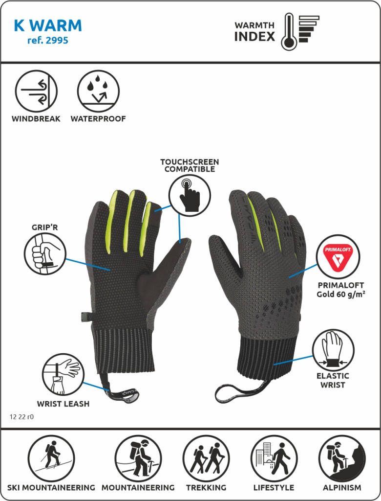 A K Warm innovatív 3D kötéstechnológiát alkalmaz, így olyan kesztyűt alkot, amely a következő szintre emeli az ergonómiát, a rugalmasságot és a teljesítményt. DRYZONE ® vízálló/lélegző membránnal és PrimaLoft ® Gold 60 g/m² szigeteléssel rendelkezik a magas szintű védelem érdekében az elemek ellen. A belső rész mikropolárral bélelt az egész napos kényelem érdekében, a tenyéren található szilikon Grip'R betétek pedig kivételes tapadást biztosítanak.