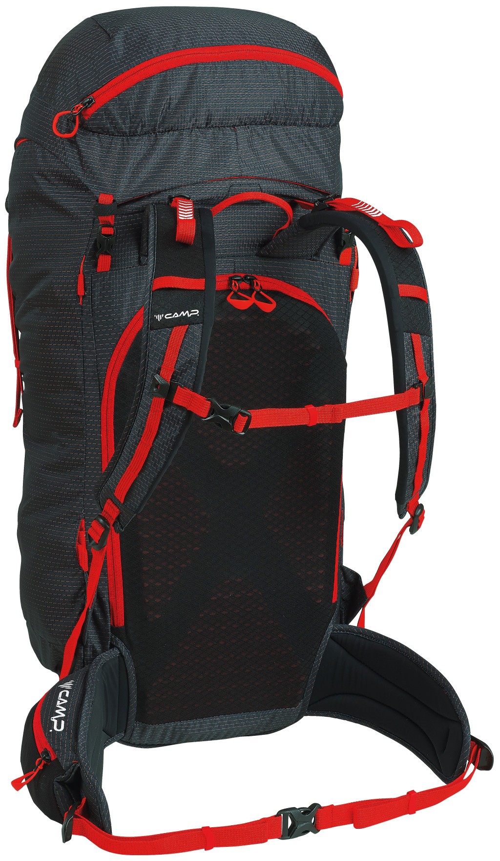 Az M45 zseniális munkát végez egy nagy hátizsák kapacitásának és egy kisebb hátizsák stabilitásának, illeszkedésének és teljesítményének ötvözésében. Magában foglalja a CAMP hátizsákok számos egyedi tulajdonságát, mint például a teljes hátsó ajtó panel, amely lehetővé teszi a hátizsák tartalmának elérését anélkül, hogy mindent le kellene venni a tetején, mielőtt hozzáférnénk az alsó felszereléshez. A kényelmet az XAir szellőző hátrész biztosítja, 3 mm-es alumínium drótvázzal és lélegző, ergonomikus vállpántokkal. A párnázott deréköv levehető a technikai tevékenységekhez. Egy cipzáras zsebbel és egy felszereléstartó hurokkal rendelkezik. Az innovatív Balance System ugyanazt a két pántot használja a vállak tetején, hogy egyszerre állítsa be, nyomja össze és stabilizálja a terhet a hátizsák aljáról húzva a felülről. A levehető fedél tetején egy nagy fő rekesz, alul pedig egy kisebb rekesz található az értéktárgyak számára. A fedél eltávolításakor egy védőhuzat húzható ki, hogy letakarja a hátizsák tetejét. További technikai jellemzők közé tartozik két jégcsákány-tartó levehető rugalmas zsinórokkal felül és fejre zárható rendszerrel alul, megfordítható síléctartó pántok, amelyek snowboard hordozására is használhatók, vagy használaton kívül elrejthetők, külső sisaktartó rendszer, amely használaton kívül elrejthető, hidratáló tömlő kompatibilitás, valamint nagy, rugalmas cipzáras zsebek a fő rekesz belsejében a további rendszerezés érdekében.