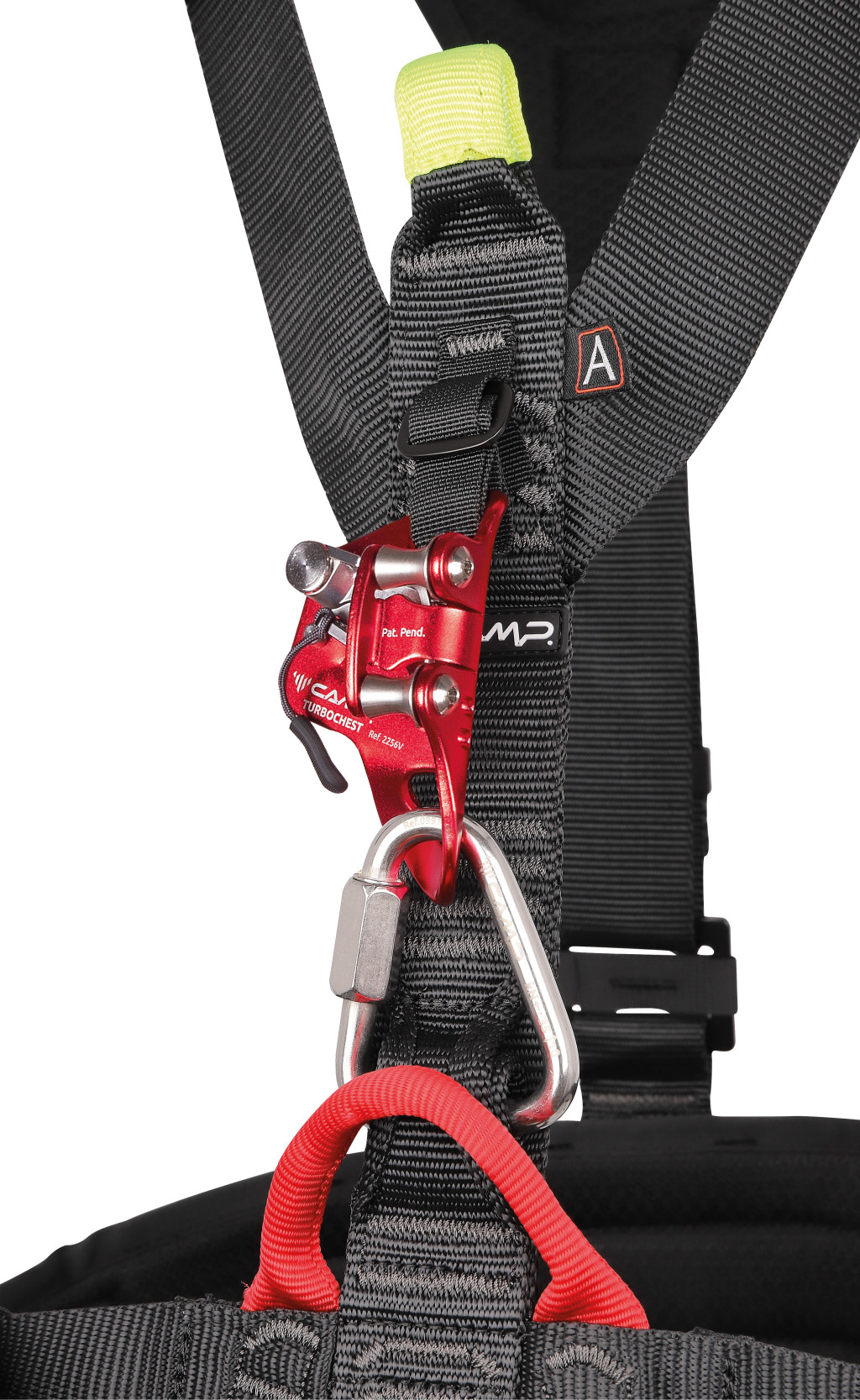 Az elülső heveder széles hurokkal van ellátva, amelybe gyorscsatlakozó vagy nyitható gyűrű helyezhető a Turbochest mászóka rögzítéséhez. A mellkasi mászóka az állítható rögzítőpánt segítségével rögzíthető a tetejéhez.
