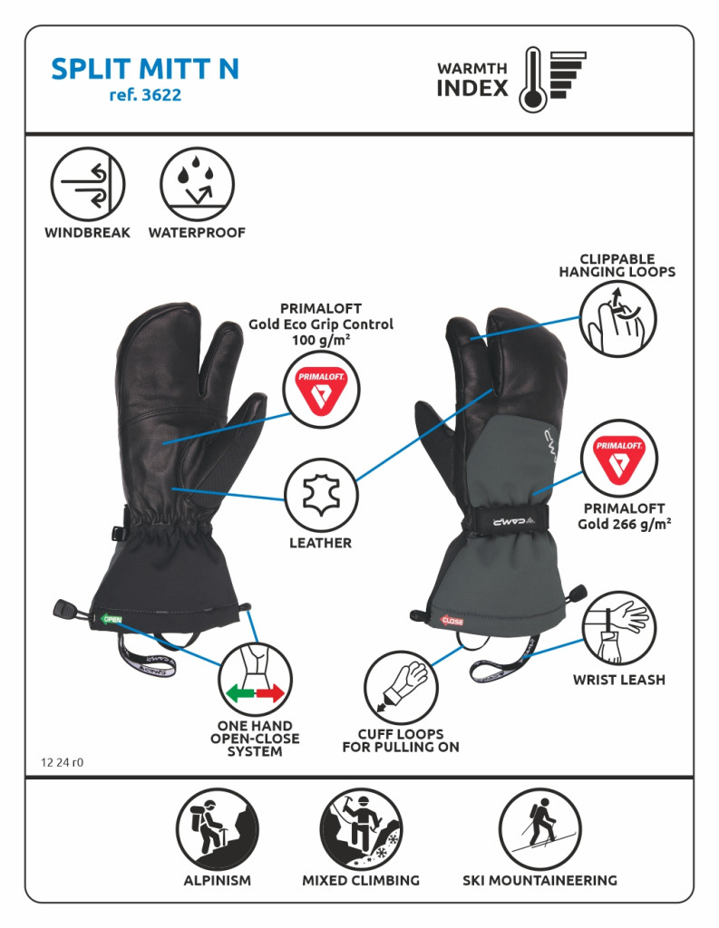 Az Split Mitt N elválasztja a mutatóujjat a fő kesztyűtől, így ötvözi a kesztyű melegét a kesztyű ügyességével és precízségével. A csuklók megnyújtottak, hogy egy kabát fölé is elérjenek, és az innovatív Open-Close rendszerrel rendelkeznek, amely egy kézzel is működtethető – csak húzd meg a Close oldalt a szorosabb meghúzáshoz, a Open oldalt pedig a kioldáshoz és nyitáshoz. A fő csuklózár mellett a csukló alsó részén található másodlagos pánt is biztosítja a precíz illeszkedést és a jobb szigetelést. A PrimaLoft® Gold 266 g/m2 szigetelés a fő testen és a PrimaLoft® Gold Eco Grip Control 100 g/m2 a tenyéren, a DRYZONE ® vízálló/lélegző membránnal és a puha, tartós kecskebőrrel a tenyéren és az ujjakon kombinálva magas szintű védelmet nyújtanak az elemekkel szemben.