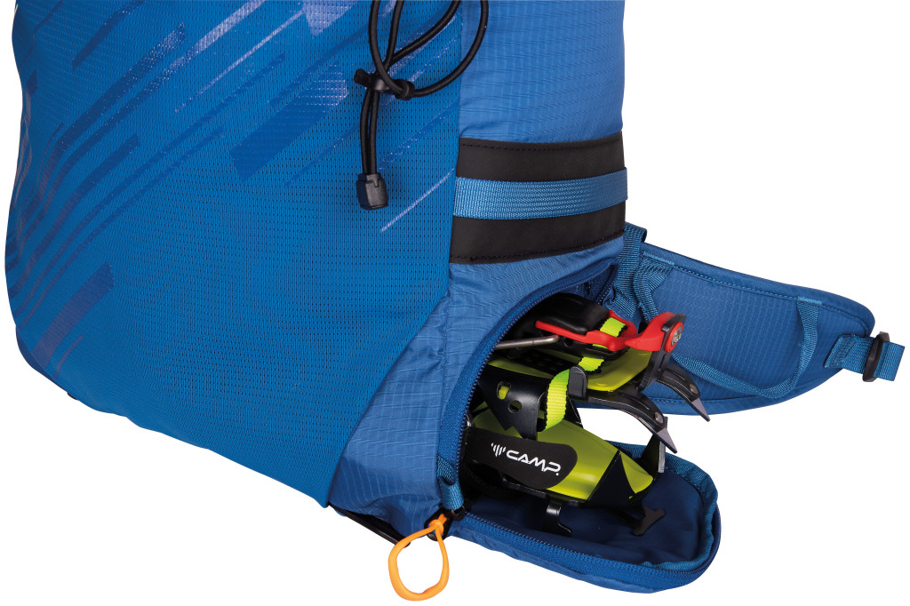 • Kettős, elrejthető jégcsákány-hordozók, a csákányok és az alumínium lemezek elrejtésére szolgáló hüvelyekkel az alján, amelyek a szerszámok fején keresztül futnak, valamint levehető tépőzáras pántokkal a tetején