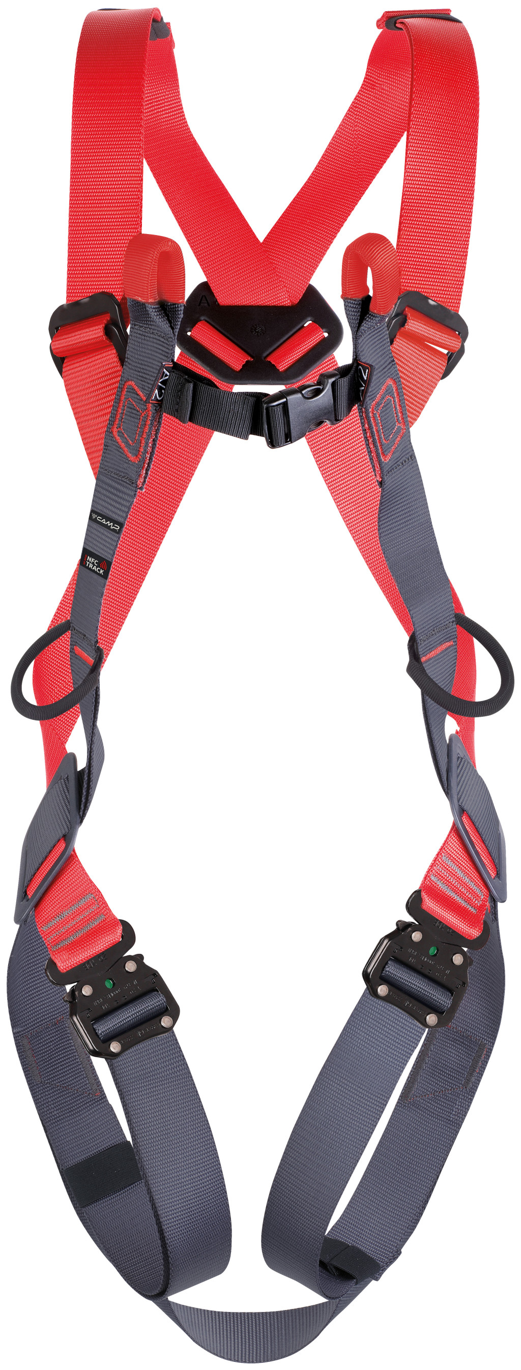 2 rögzítési pont az esés megállításához: 1 dupla textil hurok a szegycsontnál, 1 acélgyűrű a háton. Két felszereléstartó hurok.