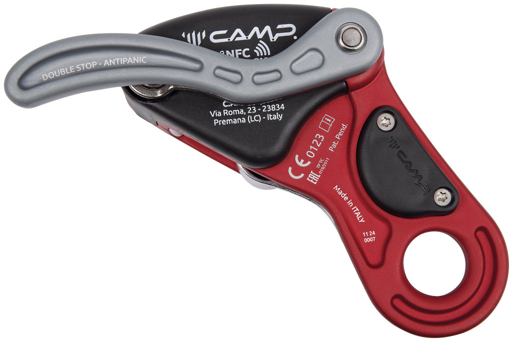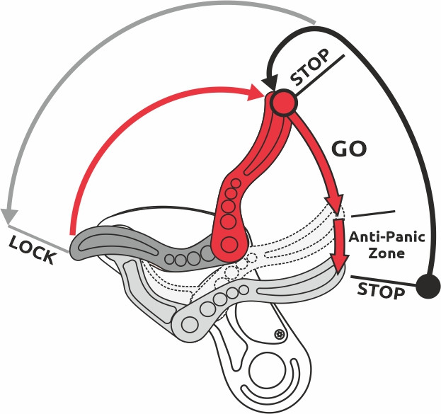 A karban egy pánikgátló funkcióval van felszerelve, amely újraindítja a bütyöket és rögzíti a kötelet, ha a fogantyút túl messzire húzza, ami veszélyes ereszkedési sebességhez vezethet. A kar automatikusan visszatér LOCK állásba elengedéskor.